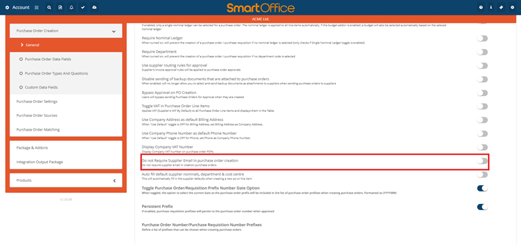 - Find the option labeled “Do not Require Supplier Email in purchase order creation”