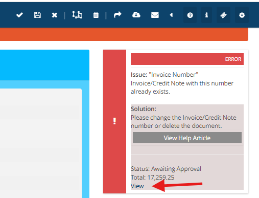 Go back to the Alerts tab, open the document, change the invoice or credit note number to a unique value, and click Save to update. - If Both the Duplicate and Original documents are in Document Issues, you will need to Delete one of these documents and then, once the duplicate has been removed, Click 'Save' on the document you wish to keep to move it on.